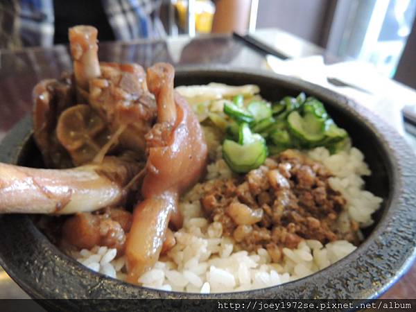 豬腳飯,豬腳不油膩,肉很嫩,入口輕輕一含不需費力咬就可下口,搭配小黃瓜與酸菜就是碗無敵的豬腳飯了!