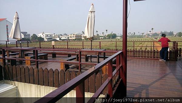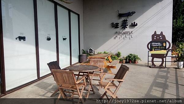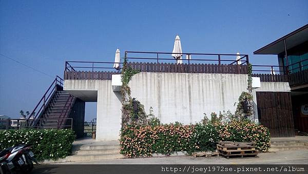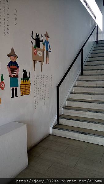 戶外這一區有拍照看板,樓梯也可去二樓露台區,白色的牆後方就是廁所,男廁與女廁的圖是貓咪喔