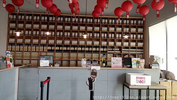 結帳櫃檯,後面牆滿滿的包裝紙盒,一旁還有產品介紹