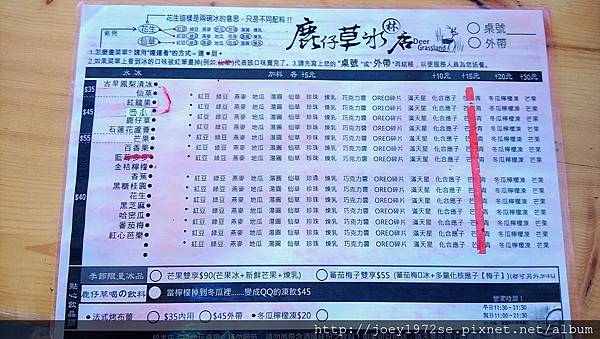 menu,先從左邊先選要吃的水冰,再選要加的配料,一種+5元,畫好單後再拿到櫃檯點單結帳,也可單吃水冰就好,鹿仔草口味是啥??沒吃過或是好奇的,好闆會先給試吃的喔,其實就是甘蔗+牧草,吃起來沒有奇怪的草味,我下次想單點來吃呢