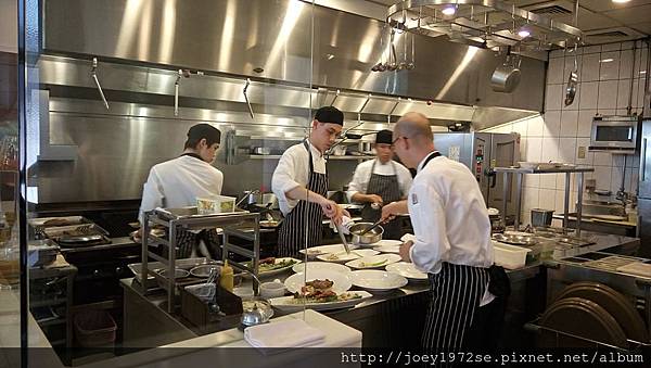 廚房也算開放式的,走道有透明玻璃可直接看見主廚們在做菜