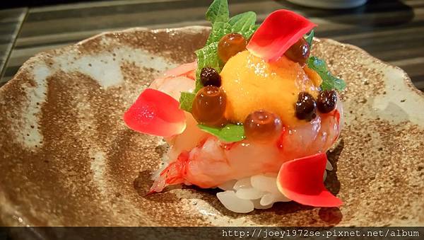 胭脂蝦+海膽,二者中有片紫蘇葉,加一些鮭魚卵,一些玫瑰花瓣,這倒也讓我看傻了,360度把盤子轉一圈,真的每個角度都美,這創意!這美感!驚人!