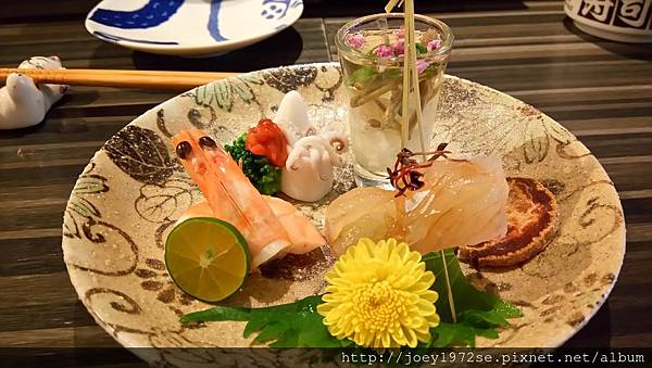 第一道~拼盤,有牛尾,花枝,白蝦,柿餅,杯子裡的是魚苗+紫蘇花穗,吃法是從杯子先開始,然後逆時鐘方向,最後是柿餅。第一道菜就讓我很開心了,這簡直就是藝術阿