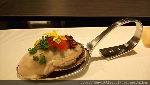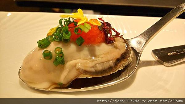 生蠔上放些明太子,紅芽,細蔥,菊花瓣,就只想要再來一顆的不滿足