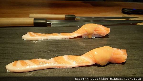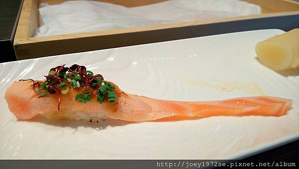 鮭魚肚油脂較多較好吃,這算是加長型的吧~呵呵~~前端炙燒尾端無處理,再抹特製醬油及細蔥,紅芽,一次吃到二種口感的鮭魚肚,還有比這更開心的嗎?