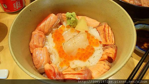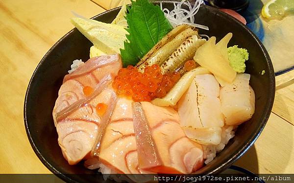 三味炙燒丼~鮭魚,干貝,比目魚側緣,食材很鮮,飯也煮的剛好,但我沒那麼愛吃飯,飯量對我來說有點多了