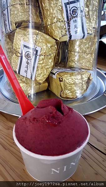 長形木器櫃台,主要以雪酪冰為主,有香草、榛果、開心果、巧克力、檸檬雪酪,芒果雪酪。。。。。等。