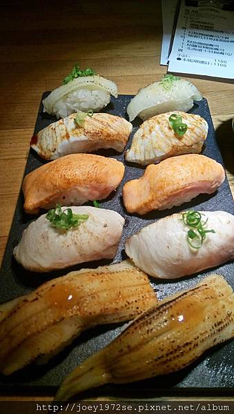比目魚緣側,海鱺腹,鮭魚腹,紅甘腹,星鰻(由上到下)