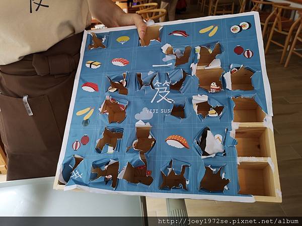 滿五盤就可以玩戳戳樂,有店內專屬的公仔或是折價卷,當天我們就搓到一張折價卷和一隻公仔