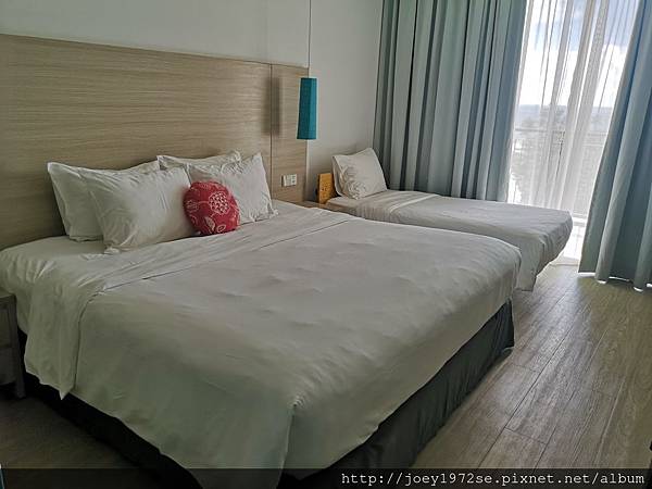 網路(booking)上訂的是二張床,check in時升等成三人房的床型,沒關係,姊妹倆可以